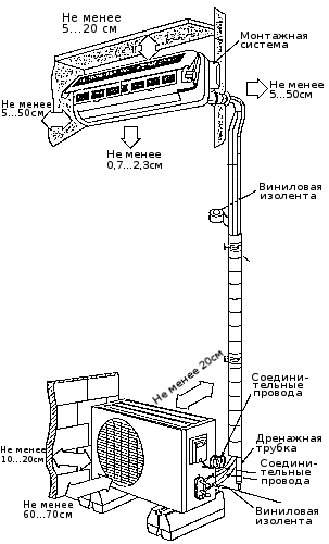 Рис. 7. Расположение внутреннего и наружного блоков сплит-системы относительно стен, пола и потолка